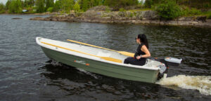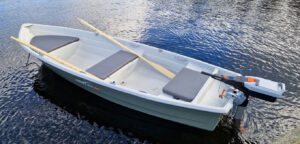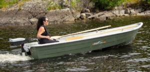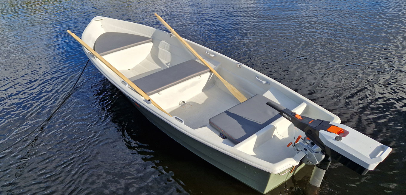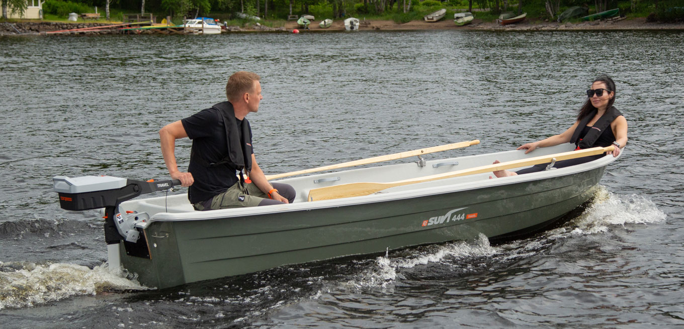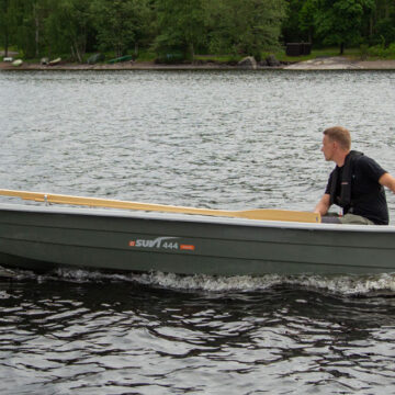 En rodd-motorbåtsmodell med bredare vattenlinje och större bärkraft för stug- och fiskebruk. eSuvi 444 har goda roddegenskaper, och formen på botten och den breda vattenlinjen gör att båten är stabil och glider fram lätt.