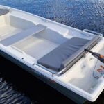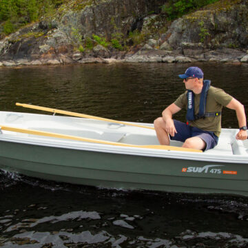 eSuvi 475 är en multifunktionell regnvattendränerande modell för stug- och fiskebruk. Båten har ett jämnt golv som är lätt att gå på, medan den löstagbara mittbänken vid behov ger extra öppet utrymme. 120 cm långt låsbart spö-/förvaringsutrymme. Fördäcket är fast utan lucka för repboxen. Utrymmet kan dock användas som repbox via en öppning i ryggstödet på framsätet. Vattnet rinner ut även när båten flyter på vattnet, t.ex. vid bryggan. Kom bara ihåg att lämna bottenpluggen öppen. Köljärn som standard!