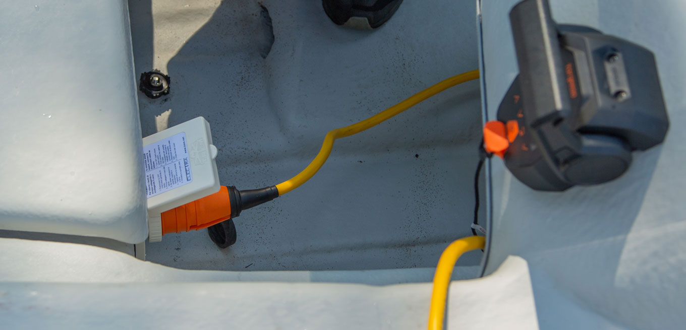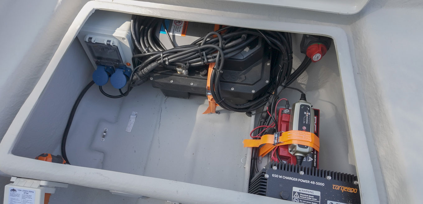 Båten har ett 5 kW drivbatteri och har dessutom ett litet separat 12 V batteri för extra apparater som standard. Båda batterier laddas samtidigt med den medföljande laddkabeln.